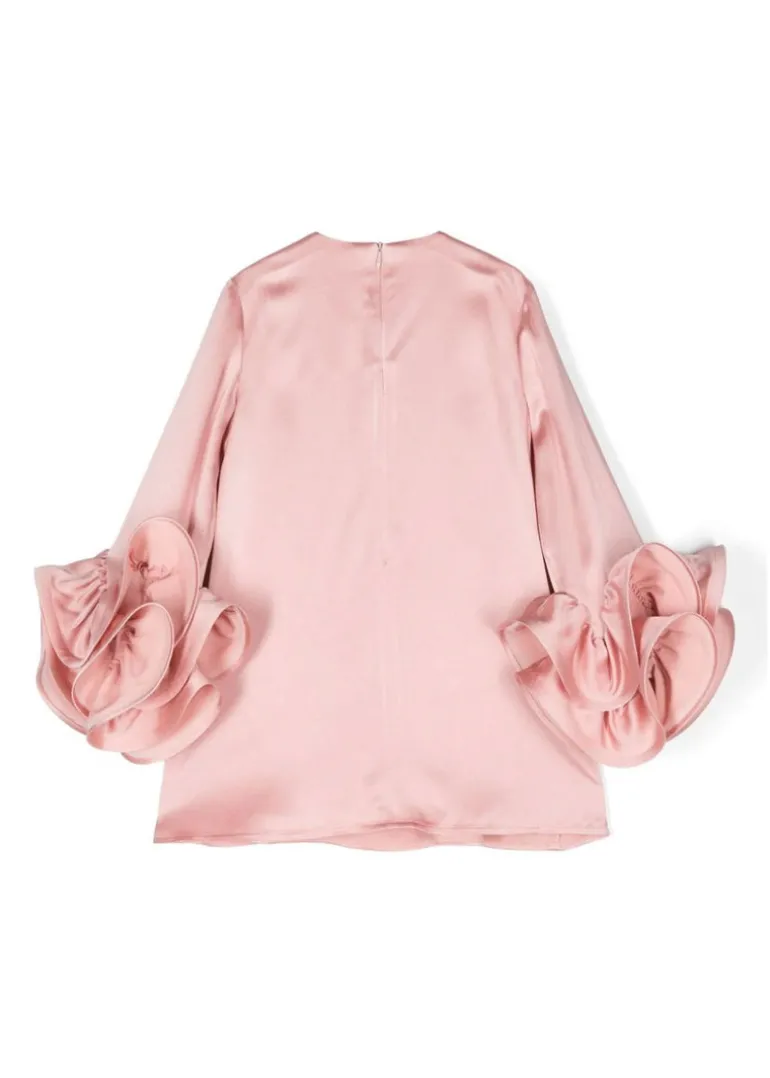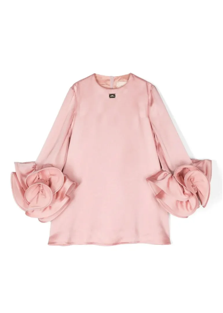 L’abito rosa Elisabetta Franchi La Mia Bambina è un capo elegante e raffinato, realizzato in tessuto raso duchesse che dona lucentezza e morbidezza. Il design presenta dettagli con ruches che arricchiscono la parte inferiore e le maniche lunghe, creando un look sofisticato e femminile. Il placcato con logo color oro sulla parte anteriore aggiunge un tocco di lusso, mentre la chiusura posteriore con zip nascosta ne garantisce praticità. La silhouette svasata e l’orlo curvo conferiscono un’ulteriore dimensione di eleganza a questo abito versatile, perfetto per occasioni speciali e momenti chic.