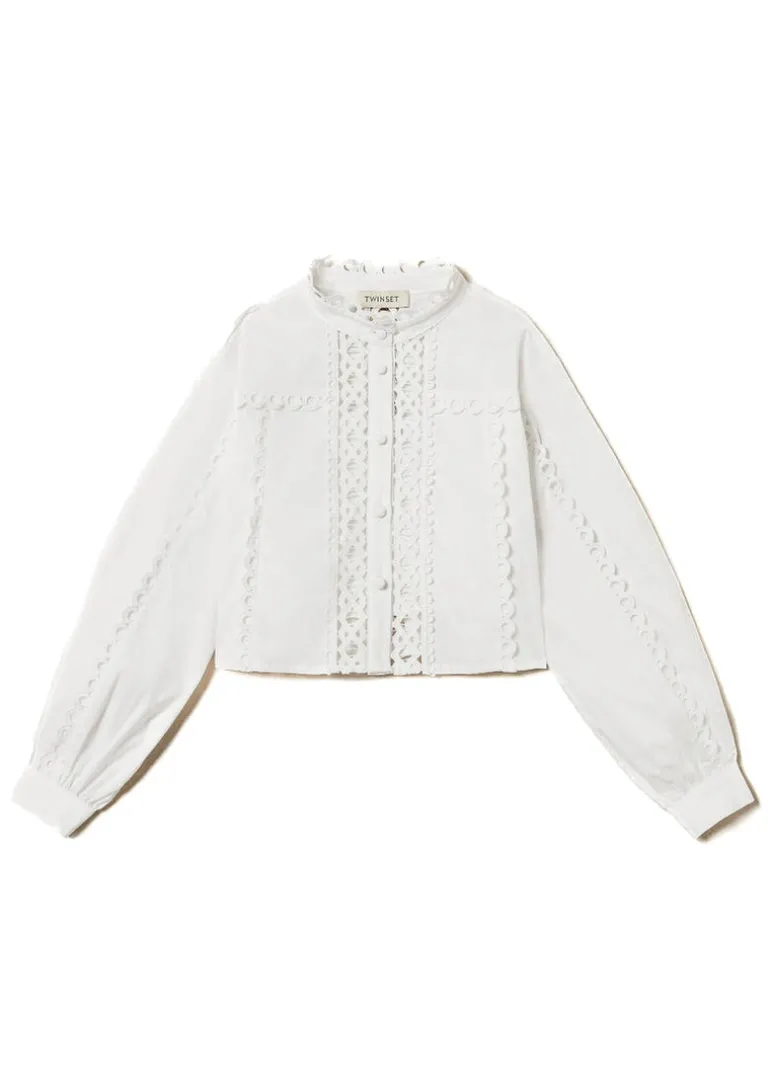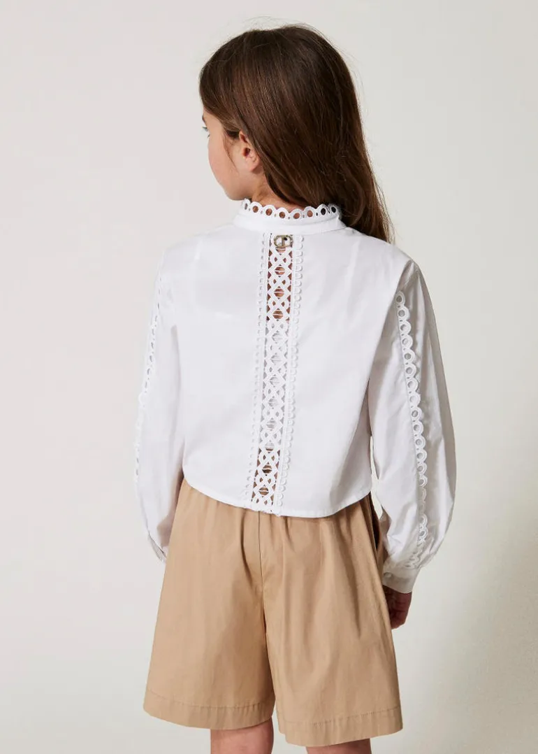 Aggiungi un tocco romantico ed elegante al guardaroba della tua bambina con la camicia bianca intarsiata firmata Twinset Kids. Realizzata in leggero popeline di cotone, questa camicia è impreziosita da raffinati ricami di passamaneria applicata e intarsiata, che creano delicati giochi di trasparenze perfetti per la bella stagione. Il design è completato da un collo alla coreana e da una chiusura frontale con bottoni ricoperti in tono, mentre le maniche lunghe rendono il capo adatto anche alle occasioni più formali. Inclusa nel capo, una comoda sottoveste in mussola coordinata assicura comfort e discrezione. Con la sua linea boxy e lo stile sofisticato, questa camicia è ideale per cerimonie, eventi speciali o semplicemente per rendere chic ogni momento quotidiano.